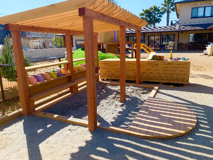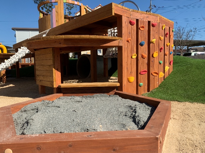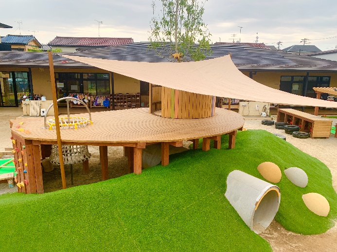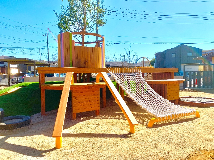 千葉県松戸市の保育園様 2026/02/17 千葉県松戸市の保育園様 トンネル付きの築山に囲まれたウッドデッキ ウッドデッキの下は潜って遊べます。 黄色い2本の板は、階段などで一度はやったことがある抱きつきすべり。おもしろいです!